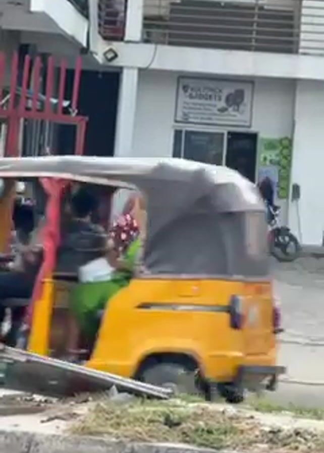 woman on a city street in front of a building. She is holding two dress-form mannequins. One is wearing a short, floral dress, and the other is wearing a long, black gown. The woman is wearing a brown patterned dress and has a purse slung over her shoulder. A car passes in front of her. Other people and a motorcycle are visible in the background. There is a sign for a business called "Voltdeck Gadgets" on the building behind her.