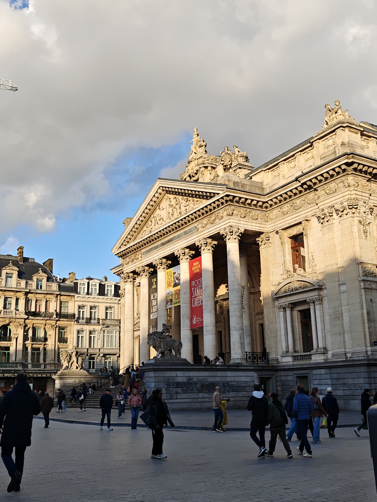 The image captures a scene in Brussels, Belgium, featuring the Brussels Stock Exchange building