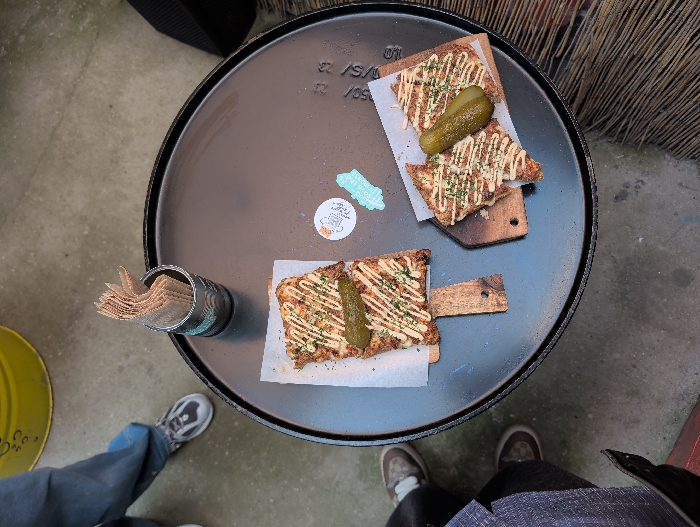 An overhead shot depicts a casual outdoor dining scene in Sofia, Bulgaria, centered on a dark, circular metal table, possibly a repurposed barrel lid, displaying faint embossed markings such as "50/4" and "33". On the table, two wooden serving boards hold food. The board on the left presents a single, large rectangular piece of toasted or grilled bread, cut diagonally into two triangles, topped with a light-colored creamy sauce drizzled in a zigzag pattern and sprinkled with green herbs, accompanied by one whole green pickled gherkin. The board on the right displays two smaller, triangular pieces of similar toasted bread, also topped with creamy sauce and green herbs, with one whole green pickled gherkin placed alongside. A silver-colored metal canister, centrally located, contains several folded brown paper napkins. Two small stickers adorn the table surface: a white circular sticker featuring a stylized black bird or chicken logo and some text (partially obscured), and an irregular light blue sticker. Parts of two individuals are visible in the frame. In the top-left, a person's lower legs and feet are seen, wearing blue jeans and grey and white athletic shoes. In the bottom-left, another person's lower legs and feet are visible, clad in dark trousers or a skirt and brown casual shoes. The floor is a light grey concrete or paved surface. A portion of a yellow metal barrel or container is visible in the top-left corner, and a section of brown, textured material, possibly wicker or straw, is present in the bottom-right. The specific food items, resembling modernized Bulgarian "princesi" (open-faced toasted sandwiches), and the distinctive table and decor style, along with the visible sticker branding (resembling that of Raketa Rakia Bar or Sputnik Cocktail Bar), indicate this scene is set in a casual, trendy eatery or bar within the city of Sofia, Bulgaria.