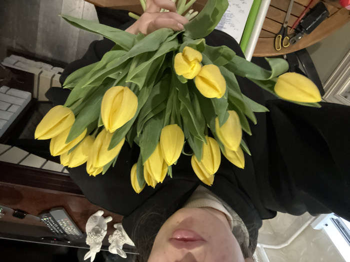 - "The image depicts an individual indoors, holding a substantial bouquet of approximately 15-20 bright yellow tulips with vibrant green stems and leaves" by FM-m4hP43, licensed under CC BY 4.0