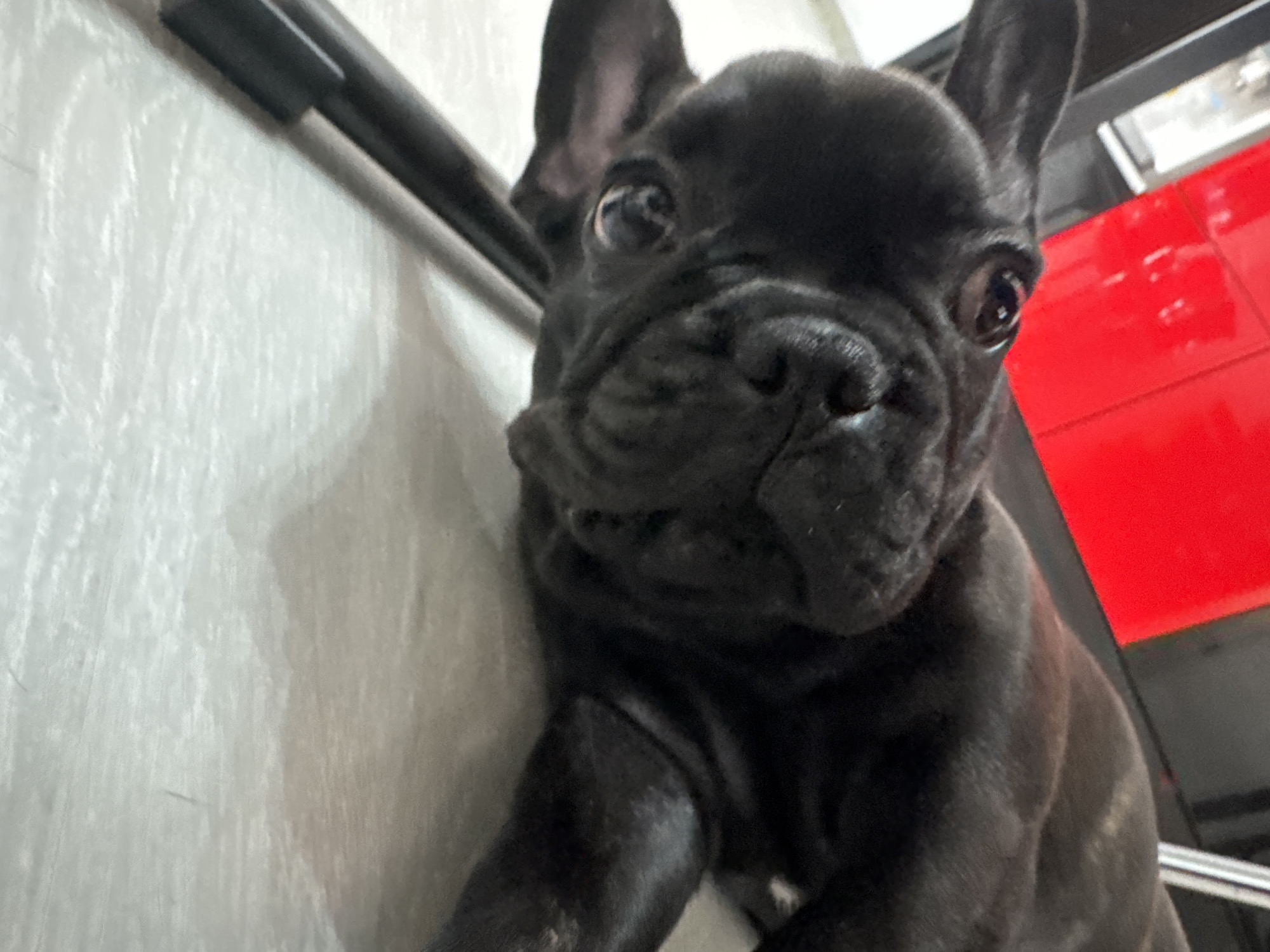 In Varna, Bulgaria, the image depicts a black French Bulldog lying on its left side on a light-colored, possibly wooden or laminate, floor. The dog's head is tilted upwards and to the left, with its dark eyes directed towards the camera. Its short, black coat exhibits minor dust or light reflections on its body. A dark, possibly metallic, object extends diagonally from the lower-left foreground across the floor. In the blurred background, a prominent bright red object, likely furniture or an appliance, is visible in the upper-left quadrant, alongside indistinct darker vertical structures.