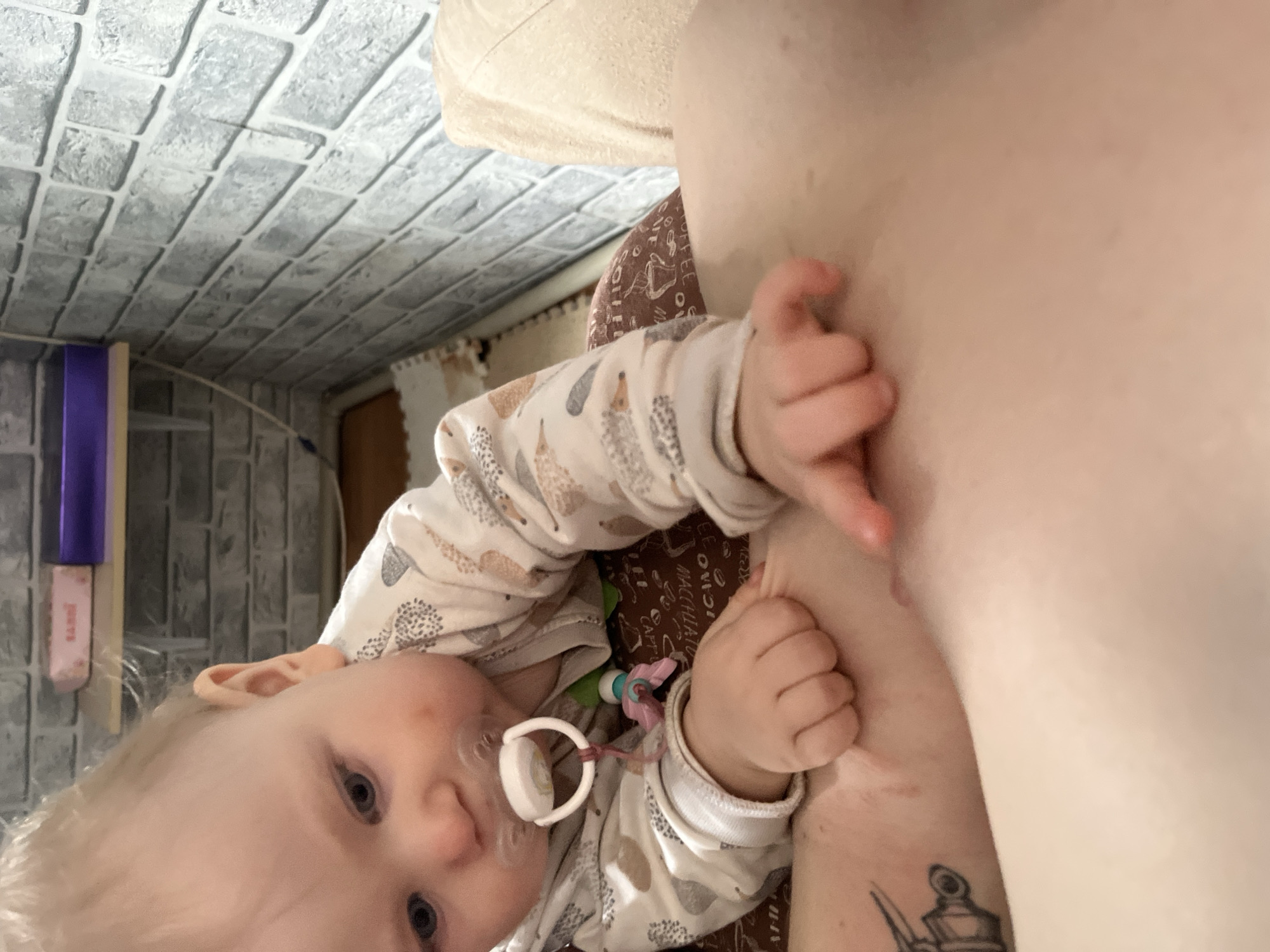 An indoor scene in Vesyoloye, Russia, displays a light-skinned infant with light blonde hair and blue eyes, wearing a white long-sleeved onesie patterned with hedgehogs. A white pacifier with a pink and teal clip is in the infant's mouth, and faint reddish marks are present on its right cheek. The infant is leaning over an adult, whose skin is visible in the lower half of the frame. The infant's right hand is fisted on the adult's skin, while its left index finger touches a specific area of the adult's skin. A black ink tattoo, depicting a mechanical object, is visible on what appears to be the adult's upper left thigh or hip area. Reddish skin marks are also present on the adult's skin near the tattoo and the point of interaction. The adult is partially clad in brown fabric, likely pants or leggings, printed with white text including "COFFEE," "CAPPUCCINO," and "MACCHIATO," alongside coffee cup illustrations. The background features a wall covered in grey faux brick wallpaper. A light wooden shelf with white brackets is mounted on the wall, holding a pink box labeled with Russian text ("ЗАЯЦ") and a purple container. A light-colored padded surface is partially visible on the right, and a section of a multi-colored foam mat is on the lower left.
