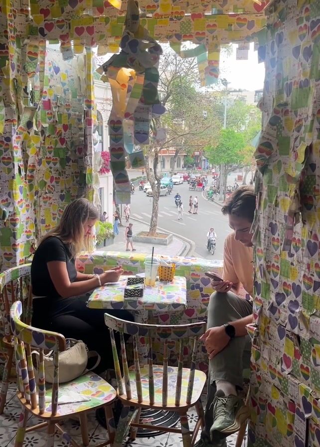 The interior of a small cafe is seen in a full shot. Two people are seated at a square table by a large window. The woman is on the left, writing in a small notebook with a pen, while the man on the right is looking at his phone. A glass of juice with a straw is on the table between them. The walls, window frame, table, and chairs are covered in colorful paper, many with heart shapes. The floor is tiled with a geometric pattern. Outside the window, a busy street scene is visible with cars, motorbikes, and pedestrians. A street light, trees and other buildings are visible in the distance. The cafe appears small and cozy, yet the overall impression is lively and bright due to the colorful decorations.