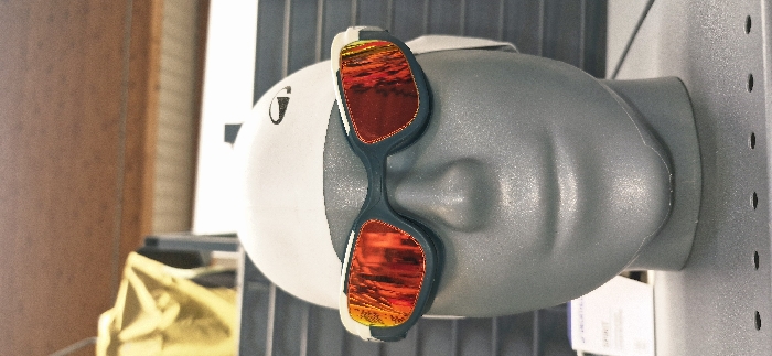 The image displays a retail store interior, specifically within a Decathlon sporting goods store located at Chemin de la Peupleraie, 62880 Vendin-le-Vieil, France. The central subject is a matte gray, featureless mannequin head, positioned front-facing on a dark gray, perforated display shelf. The mannequin wears a white silicone swimming cap, featuring a black stylized logo, likely the Nabaiji brand emblem, on its right side. Over the cap and face, a pair of swimming goggles are fitted; these goggles have a dark gray-blue frame with white outer accents and highly reflective, reddish-orange tinted lenses. A white goggle strap extends around the back of the mannequin's head. To the lower left of the mannequin, a white information tag is partially visible, showing the capitalized word "SPRINT." The background consists of blurred horizontal gray shelving or wall slats, with a yellow-tan fabric item and a dark support structure visible in the upper left, beneath a light brown or wooden ceiling. The scene is brightly illuminated, with light sources evident in the reflections on the goggle lenses.