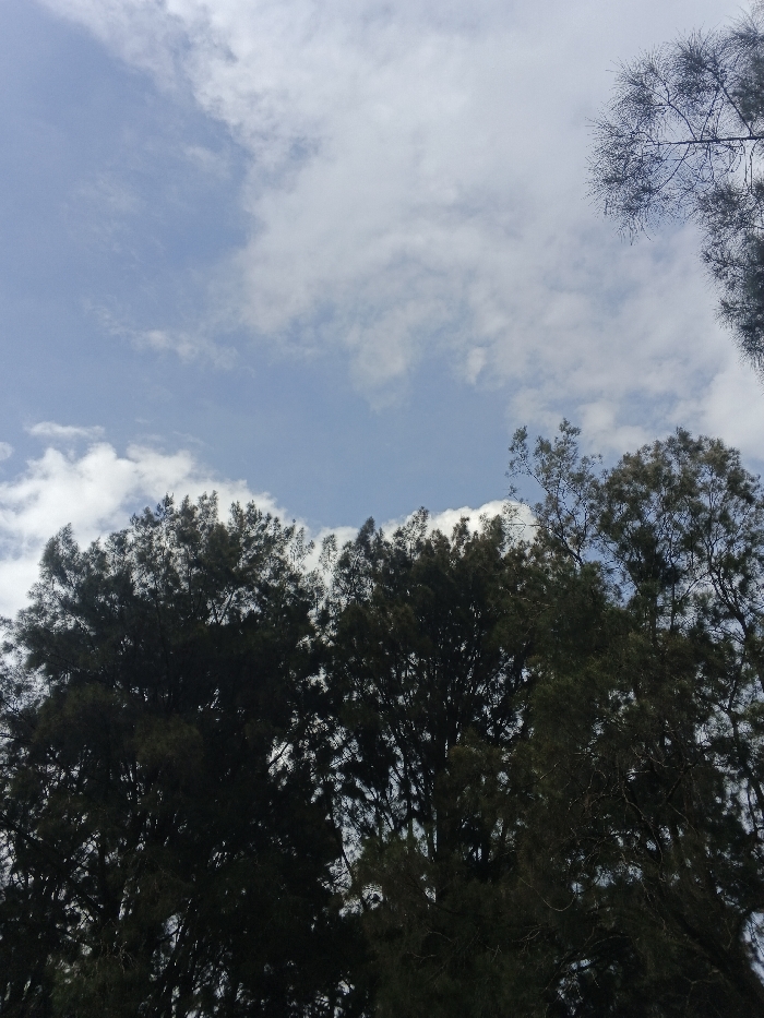 The image presents an upward perspective of a sky partially covered by clouds, viewed through the canopy of multiple trees