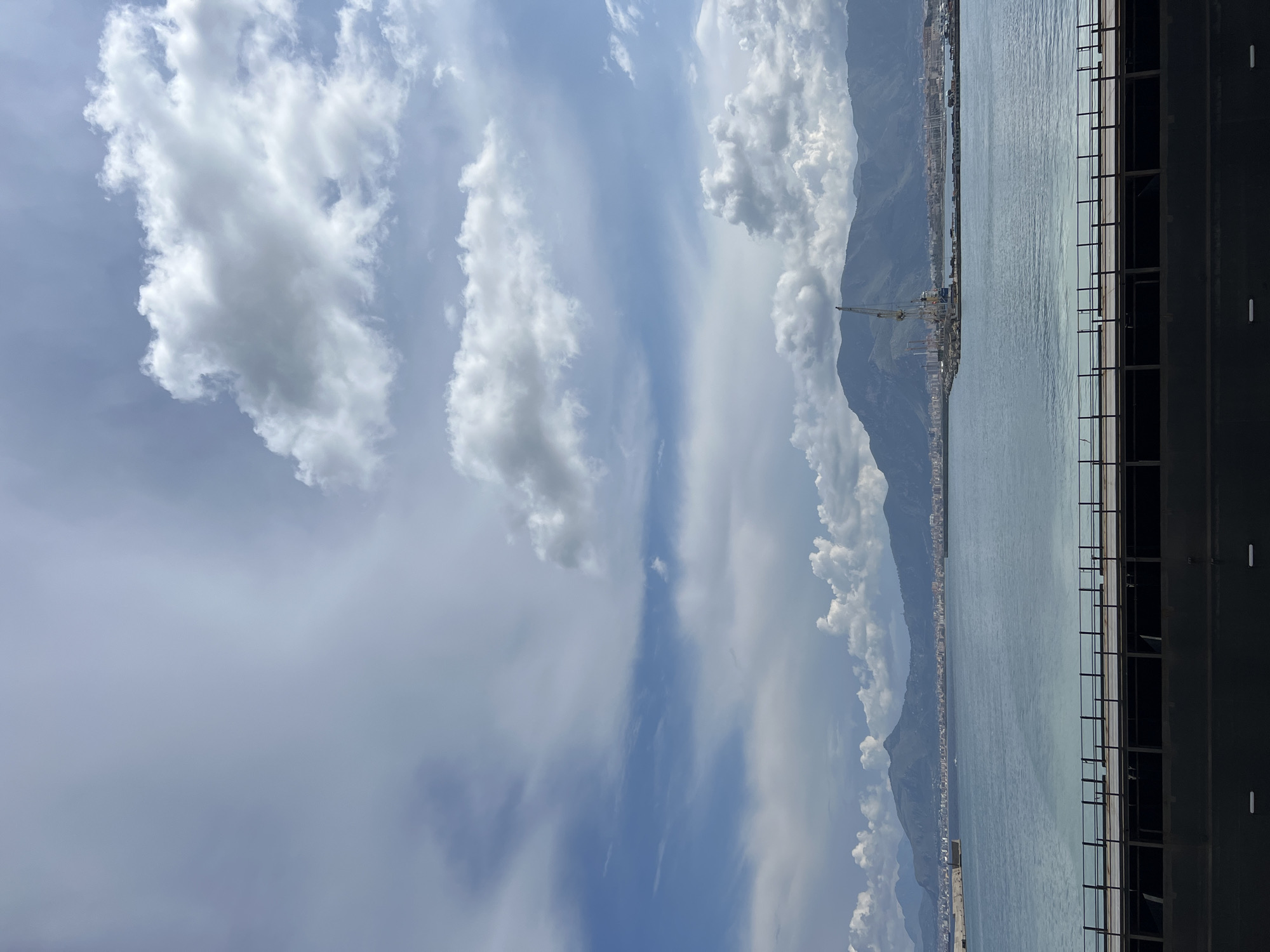 This image depicts the harbor and coastline of Palermo, Italy, viewed from an elevated perspective. The scene is dominated by a large body of calm, blue-grey water extending across the midground. In the background, a chain of dark blue-grey mountains with irregular peaks stretches horizontally, framing the urban development of Palermo at their base. Scattered buildings and structures are visible along the coastline. On the right side of the water, a significant port facility is evident, featuring a prominent, tall industrial crane, possibly a gantry crane, and various dock structures. A smaller, dark vessel is partially visible on the far left of the water, near a distant breakwater or landmass. The sky occupies the upper two-thirds of the image, displaying a mix of light blue patches and numerous white to grey cumulus clouds, indicating partial cloud cover. The foreground is occupied by a dark, multi-layered structure, likely part of a ship's deck or an elevated viewing platform. The topmost layer consists of a wooden or dark-colored deck section topped with a black metal railing composed of vertical posts and horizontal bars. Below this railing, a darker, solid hull or superstructure is visible. No people, active actions, or specific interactions are discernible within the frame.