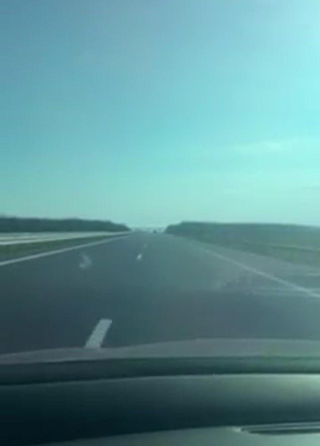 car driving down a straight highway under a clear, light blue sky. The road is asphalt, with white lane markings. Trees line either side of the highway. No other vehicles are visible nearby. The video is taken from inside the car, showing the dashboard. The horizon is visible in the distance.