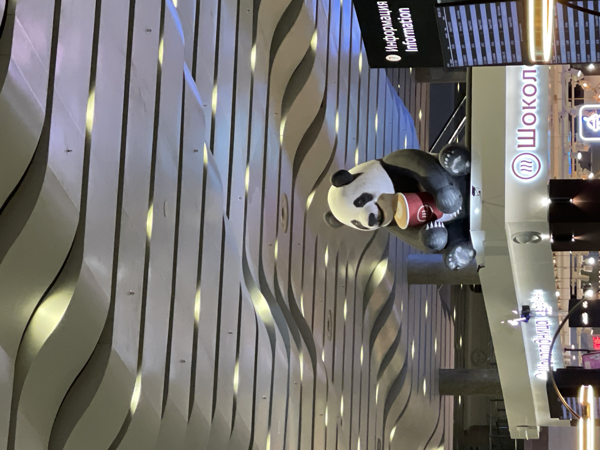 The image captures a scene in Saint Petersburg, Russia, inside a modern shopping mall. A large panda statue sits in front of a wall with vertical wavy patterns lit from behind. The statue holds a red-and-beige cup. To the right of the panda statue is a tall white structure with the word "Шокол" (Shokol) vertically displayed. Above the panda is a sign with the words "Информация Information." The environment includes other shops and lighting fixtures, suggesting a busy retail setting.