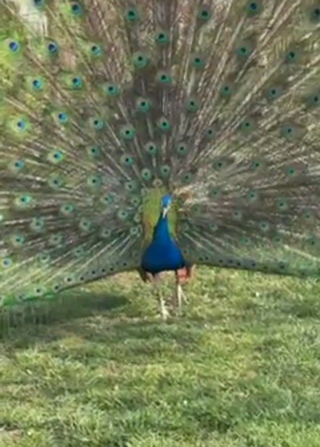 peacock standing in a grassy area with its tail feathers fully fanned out