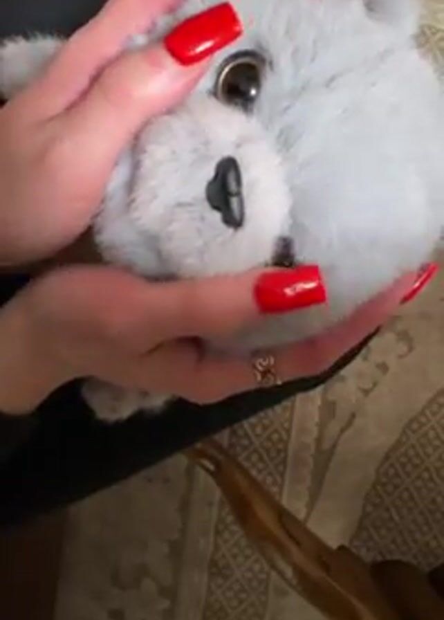 A person with long, red, square-shaped nails gently holds a grey, fluffy toy animal, possibly a seal, in their hands. The toy has large, round, golden eyes and a black nose. The person's hands, adorned with a ring on one finger, move to expose the toy's face. The background includes a patterned rug and a wooden chair or furniture leg. The person is wearing black pants.