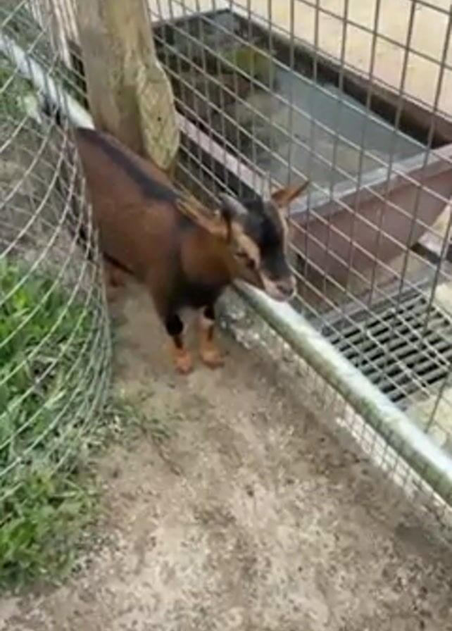 A person outside a metal fence with goats in the enclosure calls to a goat with a black head and brown body. The goat looks towards the person calling. Other goats are visible in the background.