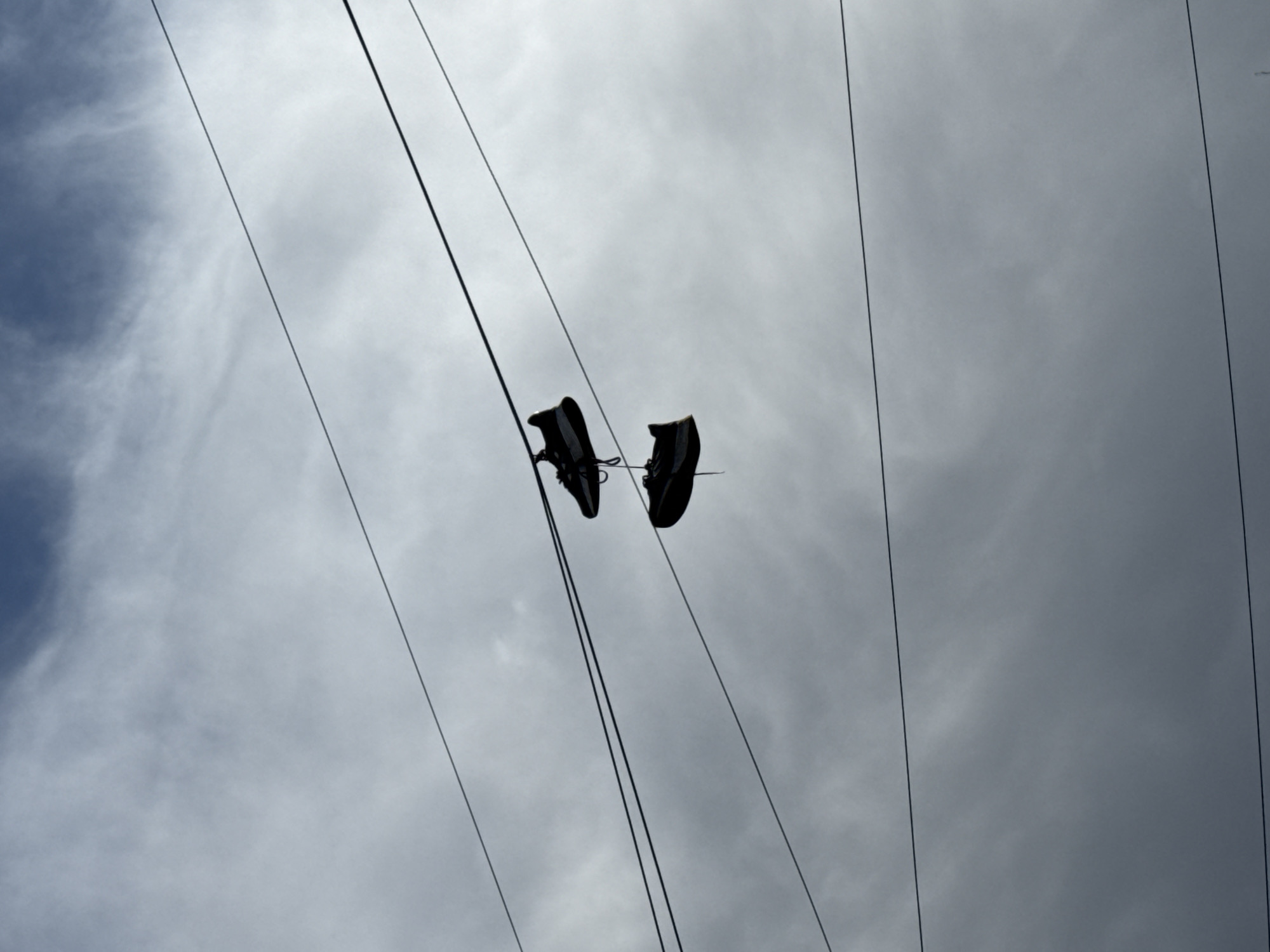 - "The image displays a pair of dark athletic shoes, identified as sneakers, suspended by their tied laces over a single overhead utility wire" by FM-oH6mZ2, licensed under CC BY 4.0