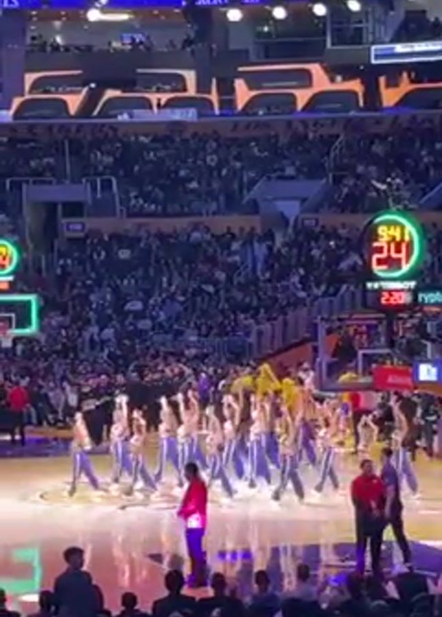 A basketball court is filled with dancers wearing blue and white costumes. The dancers perform in unison. A basketball net and scoreboard are visible in the background. The stadium seating is filled with fans. Several staff members in red shirts stand along the court.