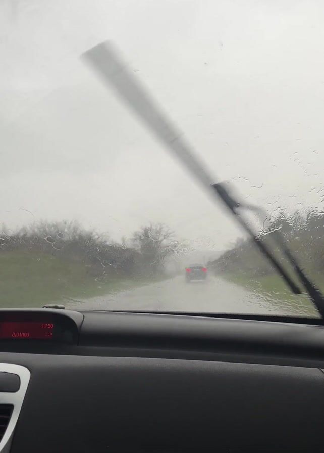 car driving on a wet road. Rain is visible on the windshield, and the windshield wipers are in motion. The car is following another vehicle, visible in the distance. The dashboard of the car is visible, including the speedometer, radio, and air conditioning vents. There is an air freshener hanging from the rearview mirror. The car appears to be driving on a rural road with trees on either side. The sky is overcast and grey.