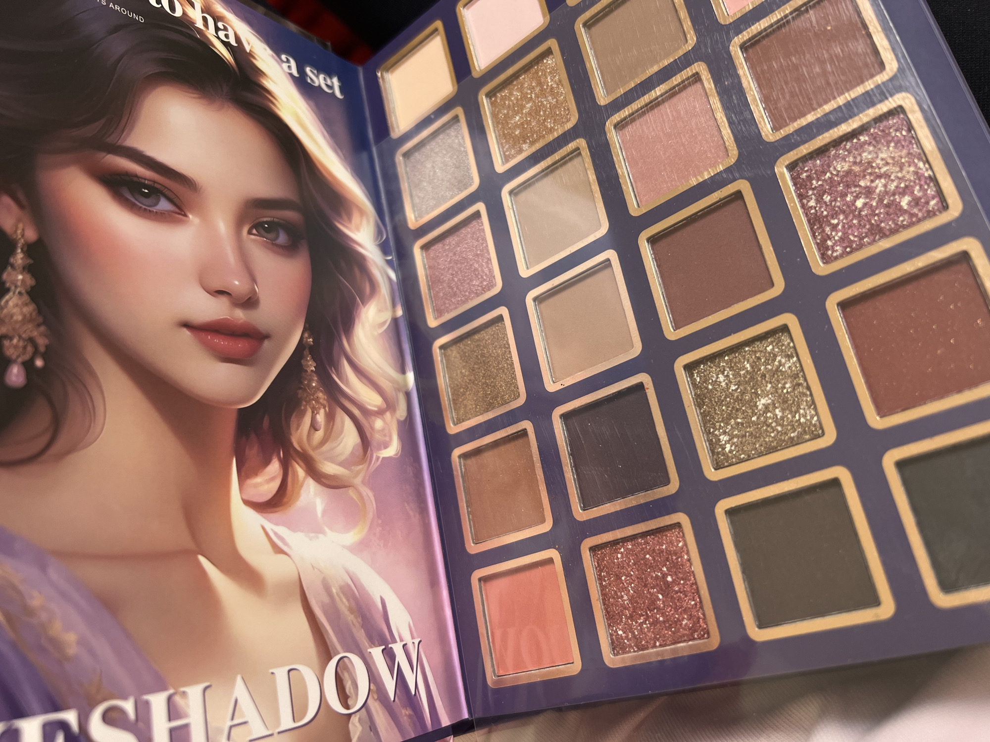 The image displays an open, rectangular cosmetic eyeshadow palette. The palette's lid features a stylized illustration of a female's face and upper torso, depicted at an angle, with dark hair, light skin, and soft makeup including reddish lips and eye makeup. Partial text "SHADOW" is visible vertically on the left side of the lid, and "GO HAVE A SET" or similar text is on the right, against a background of purple, pink, and gold swirling patterns. The palette's base is dark purple, containing 24 individual square eyeshadow pans arranged in four rows of six. Each pan is bordered with a gold-colored trim. A thin, transparent plastic sheet covers the eyeshadow pans. The shades presented include a variety of mattes, shimmers, and glitters, encompassing colors such as coral, various browns, beige, light pink, rose gold, silver, dark gold, and dark grey/black. The palette rests on a light-colored, soft fabric surface, possibly beige or pale pink, which occupies the lower left portion of the frame. The background to the right is dark and out of focus. The image contains no discernible information regarding its geographical location within the city of Kabile, Bulgaria, or any other specific location.