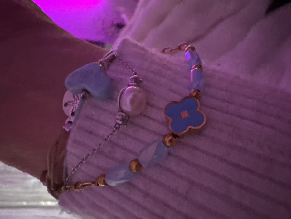 Two bracelets adorn a wrist. One features a silver chain with a large blue stone, a coin-like charm, and a faux pearl. The second bracelet consists of small, pale blue stones interspersed with gold beads and a blue four-leaf clover charm with gold trim. The wrist rests against a white, vertically ribbed sweater sleeve. A bright pink light shines from above.