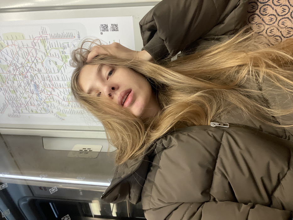 A woman with blonde hair touches her hair in a selfie. She is wearing a brown puffer jacket. A subway map is visible behind her, alongside the interior of the subway car. The lighting suggests it is daytime. Her lips are slightly parted, giving a relaxed expression. A zipper is visible on the jacket collar. The image is angled.