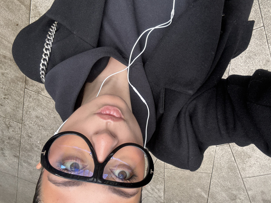 The image displays an angled, close-up portrait of a woman located in Courbevoie, France. She gazes directly at the camera. Her dark hair is styled away from her face, revealing prominent eyebrows and light-colored eyes, which are framed by large, black-framed aviator-style glasses with clear lenses exhibiting blue light reflections. A distinctive "T" logo is visible on the left temple of the glasses. White wired earphones are draped around her neck and over her right shoulder. She wears a black hooded garment under a black, structured coat. A silver-colored, heavy-gauge chain is visible on the right shoulder of the coat, suggesting it is either an embellishment or part of an accessory. Her lips are slightly parted. The background consists of a light-colored, rectangular tiled surface, consistent with outdoor paving.