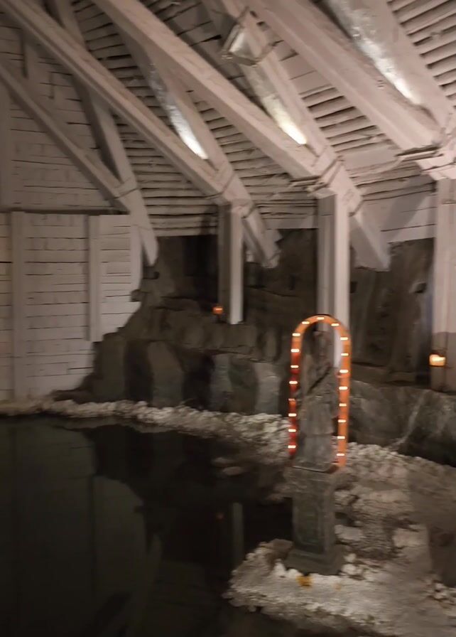 n underground structure with a body of water and white wooden architecture. The camera slowly pans from right to left. The architecture consists of a low-slung, peaked roof supported by white pillars. Below the roofline on the right side, there is a gray rock formation, upon which there are a few small candles. In front of the formation, a statue stands on a small pedestal, framed by an arched, orange light. The statue and its lighting are reflected in the dark body of water. On the left, there's a white brick wall with an opening leading to a tunnel illuminated by green light. Above the opening, there is a white plaque with text. The reflection of the tunnel and plaque are also visible in the water. The overall lighting is dim, emphasizing the glow of the candles and lights.