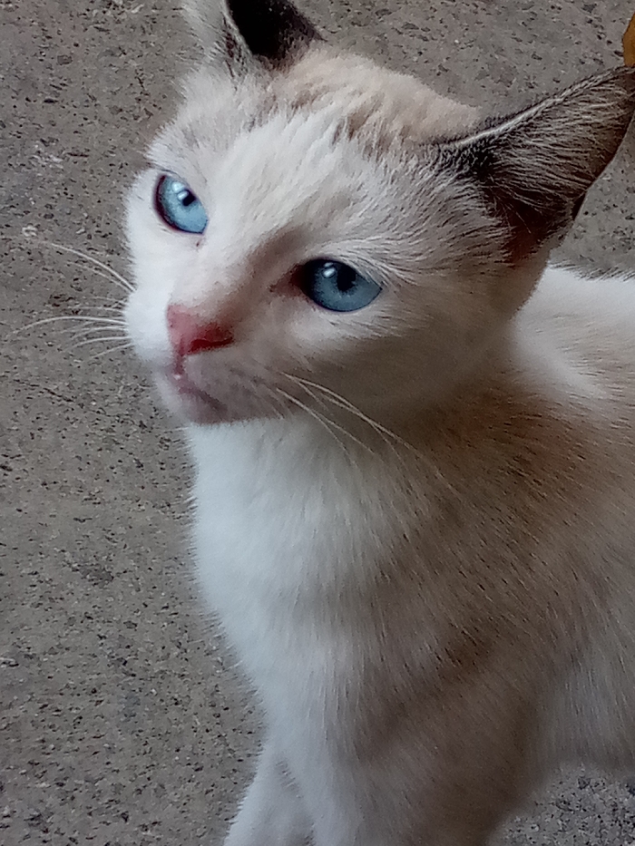 A domestic cat is depicted in a close-up, partial body shot, located in Las Guevaras, Venezuela. The feline exhibits a cream and white colorpoint coat with dark brown ears and light tan markings on the visible shoulder and back. Its eyes are a prominent bright blue, and its nose is pink. Numerous white whiskers extend from its muzzle. The cat's head is angled slightly to the left, with its gaze directed upward and to the left within the frame. The immediate environment is a uniform, textured grey surface, consistent with concrete or pavement. No other subjects or objects are visible.