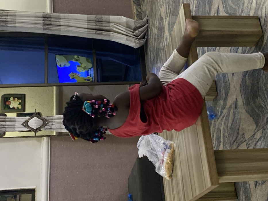A young girl in a red shirt and light-colored pants sits on a table, legs propped up. She has beaded braids in her hair and seems to be watching the Lion King on TV. The curtains are drawn, and a bag of snacks sits on the table near her. The wallpaper has a unique marble pattern.