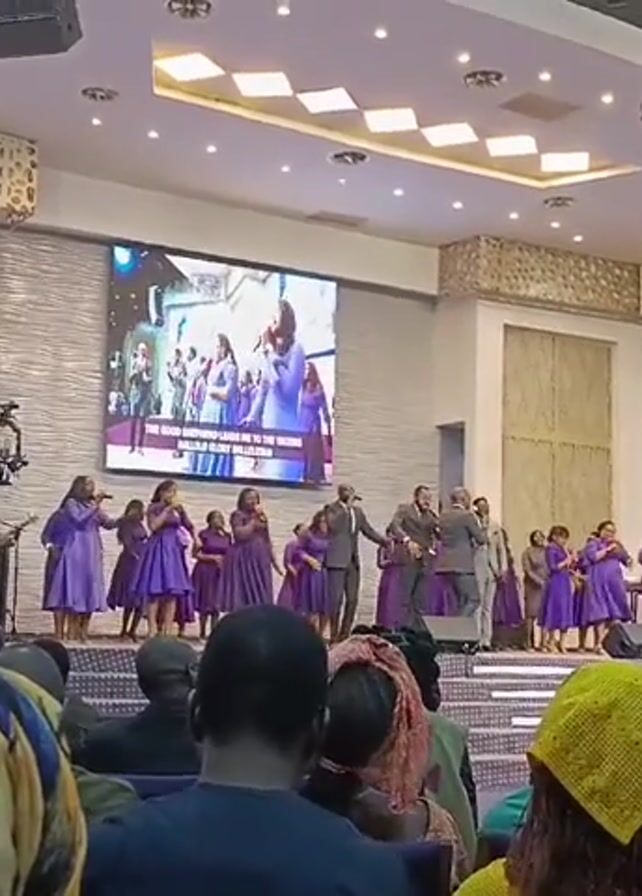 The interior of a large church is shown, filled with people. A large choir, wearing purple robes, performs on a raised stage, accompanied by a band with drums, guitar, and keyboard. On either side of the stage, large screens show close-ups of the singers. The audience is diverse in age and attire. The lighting is bright, and the atmosphere is lively and celebratory, with people seen singing and moving. There are cameras filming.
