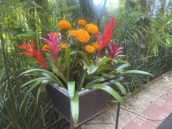 This image captures a close-up, eye-level view of a dark-colored, rectangular planter filled with an assortment of plants and flowers. The planter is elevated on a slender, dark metal stand. Within the planter, several clusters of vibrant orange marigold-type flowers are visible, predominantly in the upper left and center. Interspersed among these are three bromeliad plants, each featuring distinct, upright inflorescences: one bright red spike on the left, one bright pink spike in the center-left, and a dark magenta spike on the right. These bromeliads exhibit broad, green foliage. The background consists of dense, lush green vegetation, characteristic of a garden or tropical environment, including ferns and various broad-leafed plants. Bright sunlight filters through the upper portion of the foliage, creating illuminated areas and a slight lens flare effect. In the lower right foreground, a paved surface is visible, composed of light-colored square tiles alternating with reddish-brown square tiles. Some of the reddish-brown tiles feature a lighter-colored, etched pattern. A thin black cord or hose lies across the tiled surface in the bottom right corner. No individuals are present in the scene, and no discernible actions or interactions are taking place. The setting is located in the city of Querétaro, Mexico.