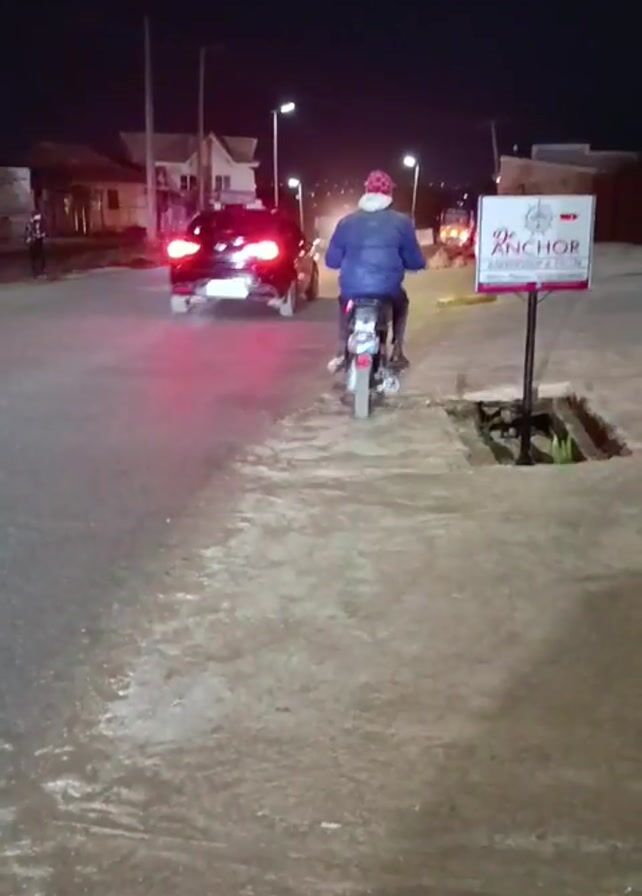 At night, a street scene unfolds. A black car pulls away from the camera, heading towards the center of the frame. A man on a motorbike follows behind it, also moving towards the center. The street is illuminated by streetlights and the headlights of the vehicles. A sign for "De Anchor Authentic Salon" is visible on the right side of the road. Buildings line the street in the background. Other people are present, including a man standing in the distance.