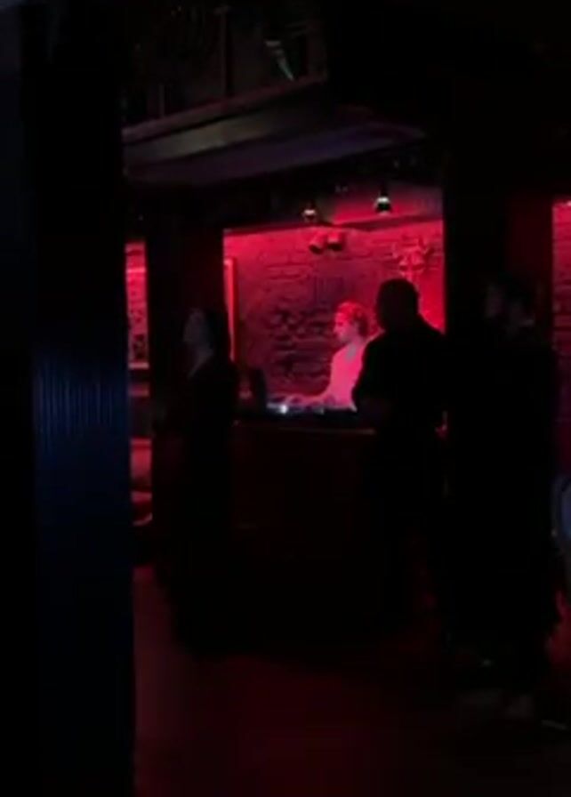 n indoor scene, likely a nightclub, dimly lit with red ambient lighting
