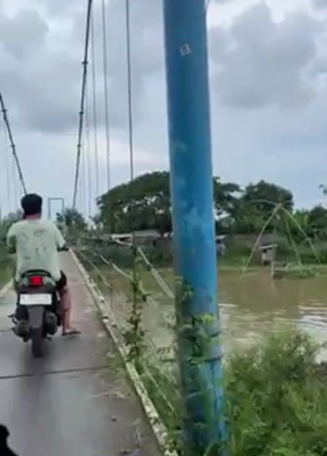 motorized boat on a river with people onboard. The second scene shows a person riding a motorbike on a suspension bridge across the same river. The river water is murky. The sky is overcast with grey clouds. The riverbanks are lush with green vegetation and trees. The suspension bridge appears sturdy.