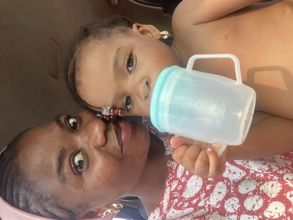 A close-up photograph captures an adult female and a young child, appearing to be in the city of Lokoja, Nigeria. The specific location within Lokoja is indeterminate, as the background consists of the light brown interior roof lining of what appears to be a vehicle. The adult female, positioned on the left, has dark skin and braided hair partially covered by a light pink headwrap. She wears a red and white patterned garment on her torso and two gold-colored hoop earrings on her left ear. Her gaze is directed towards the camera, her right eye wide open, with a slight smile on her lips. To her right, a young child, identified as an infant or toddler, also has dark skin. The child's dark hair is styled in small braids or twists, with decorative reddish and clear beads visible on a braid near the left temple. The child is shirtless and wears a single small, gold-colored hoop earring on the left ear. The child is actively drinking from a transparent plastic sippy cup with a light blue lid, holding the cup with both hands. The cup has visible volume markings up to 200ml. The lighting in the scene appears to be natural daylight.