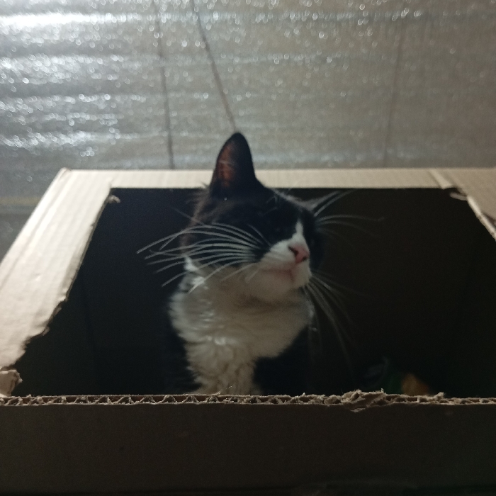 - "The scene depicts a domestic bicolored cat, predominantly black with a white muzzle, chest, and paws, positioned within an open, light brown cardboard box" by FM-5jr0c2, licensed under CC BY 4.0