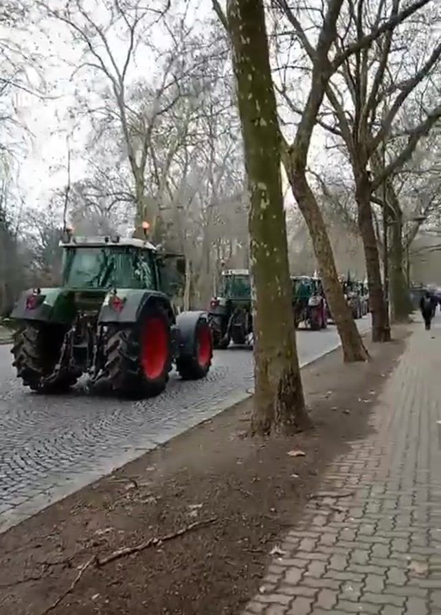 convoy of green Fendt tractors driving along a cobblestone road lined with trees on both sides. The trees are bare, suggesting it is winter or early spring. There is a sidewalk on the right side of the road, with a few people walking along it. The sky is overcast and appears grey. The focus is on the tractors, particularly their rear view.