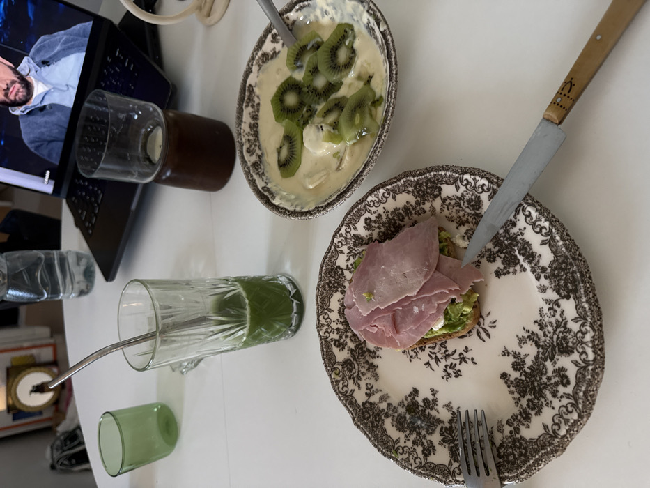 A table setting features a laptop playing video. There is a bowl of sliced kiwi and banana in a creamy sauce, a plate with avocado toast topped with ham, a knife, and a fork. Several glasses contain various liquids: one clear, one dark brown, one green with a metal straw, and a small green glass. The plates and bowls are ornately decorated.