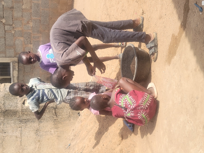 An outdoor scene in Sabojibi, Nigeria, depicts five individuals, primarily children and youth, gathered around a dark basin on dry, light-brown earth