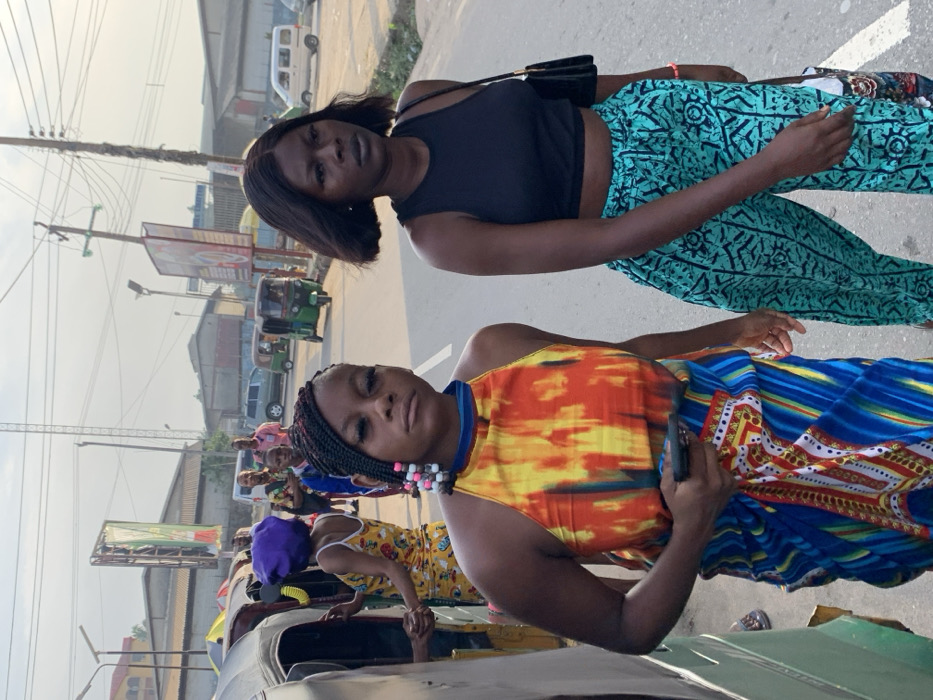 This image captures a daytime street scene in the city of Aba, Abia, Nigeria. In the foreground, two young Black females are prominent. The female on the left wears a multi-colored halter-neck top featuring orange, yellow, and blue patterns, paired with a blue and white patterned wrap or skirt. Her braided dark hair includes several light-colored beads on the left side. She holds a dark smartphone in her right hand and looks directly towards the camera with a neutral expression. The female on the right, positioned slightly behind the first, wears a black sleeveless crop top and loose-fitting teal-colored trousers with dark geometric patterns. She has short, dark, bob-length hair and carries a small black shoulder bag in her left hand, and another patterned bag in her right, while looking slightly to her right. To the left, part of a green and black three-wheeled vehicle (rickshaw) is visible, with another female in a yellow patterned outfit and a purple head covering standing near it. The background displays a paved road occupied by multiple green three-wheeled rickshaws, a silver car/SUV, and a white van. Utility poles with extensive wiring, streetlights, and large commercial billboards are visible along the road. Distant buildings with light-colored facades and corrugated roofs line the street. The sky is a light blue with minimal cloud cover.