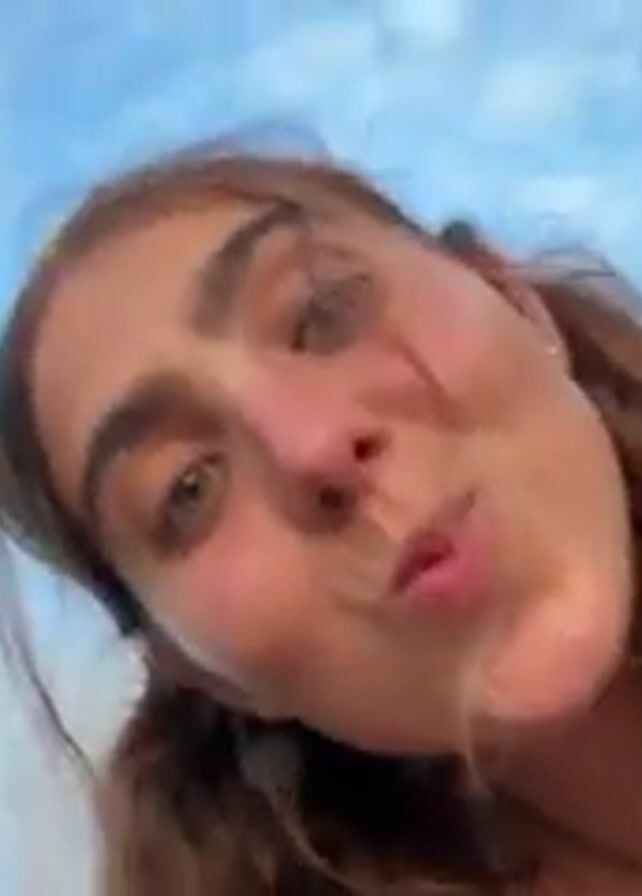 A low-angle selfie video shows a young woman with light brown curly hair and blue eyes making a duck face