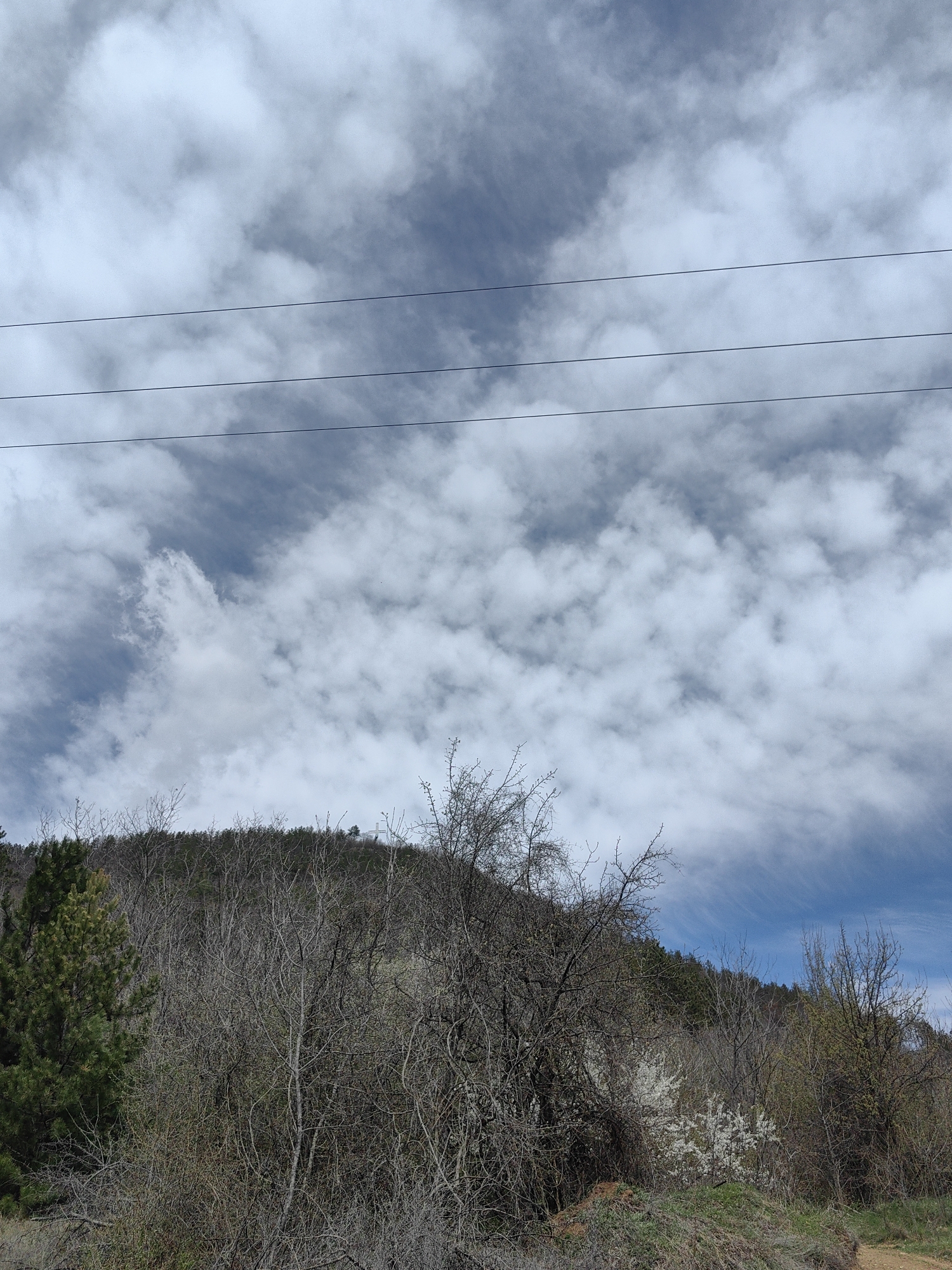 The image depicts a landscape scene near Vrabevo, Bulgaria. In the foreground are scrubby bushes and trees with bare branches, some beginning to show early spring growth. A single evergreen pine is visible. Behind the vegetation is a low, wooded hill or mountain. Overhead, the sky is filled with a mix of white and gray clouds, with visible patches of blue. Power lines stretch across the upper portion of the image. There is no indication of any people, subjects, objects, actions or interactions in the frame.