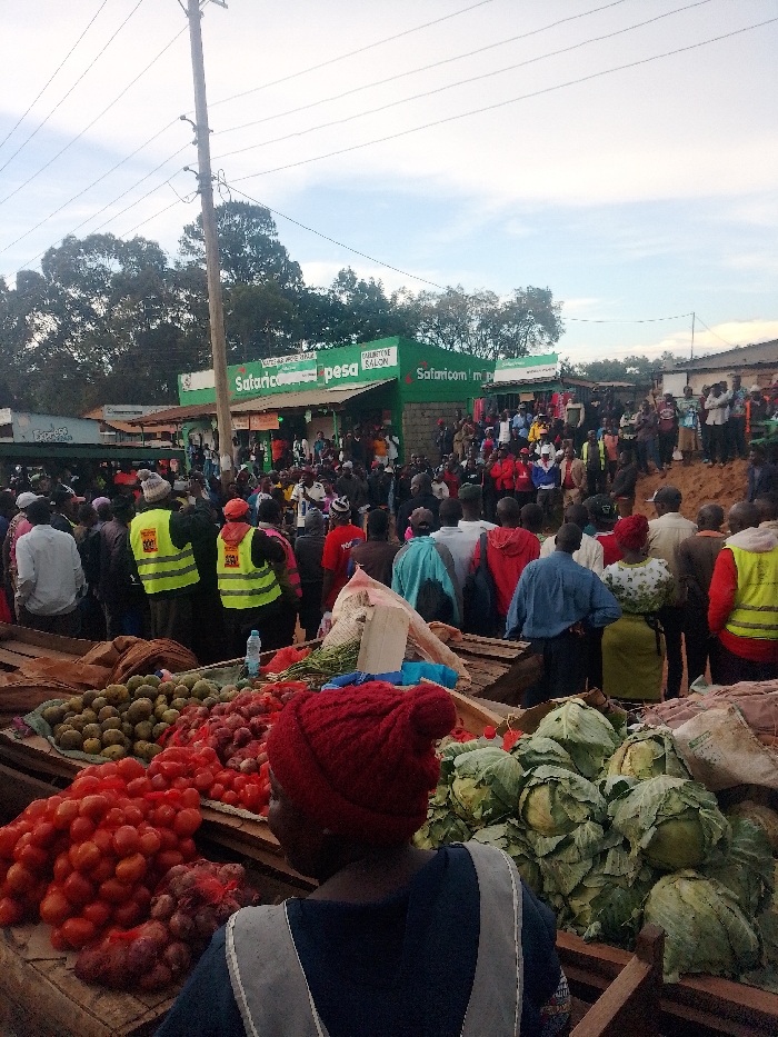 This image captures a bustling outdoor market scene in Chevaywa ward, Kenya