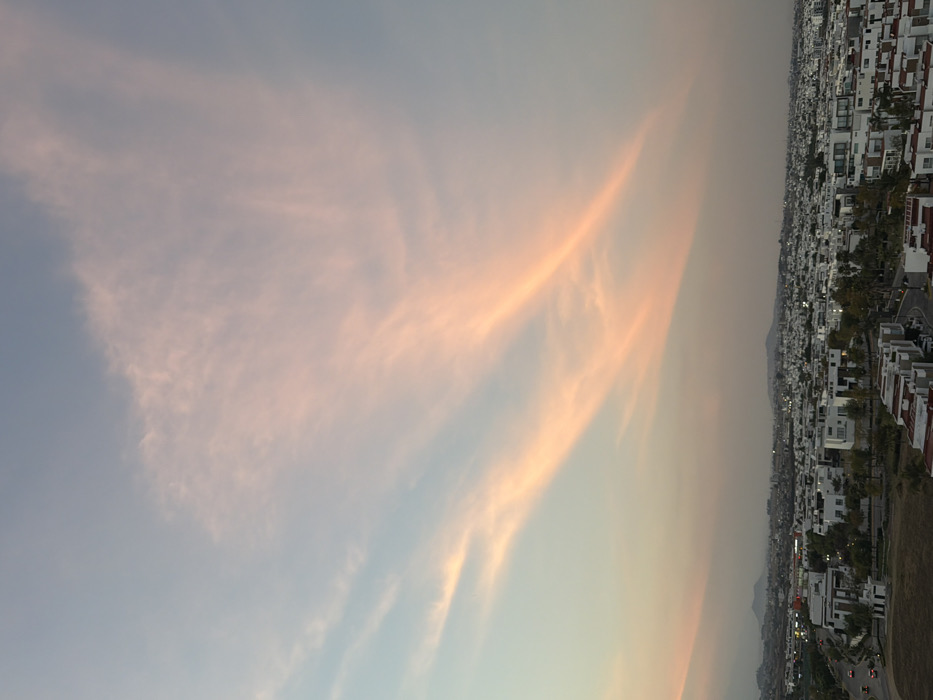 An expansive sky filled with wispy, ethereal clouds tinged with pink and peach hues, suggesting a sunset or sunrise. To the right, a sprawling urban landscape unfolds, dominated by white buildings punctuated with green trees. The buildings are densely packed, reaching towards the distant horizon where a subtle mountain range can be discerned. The overall image conveys a serene yet urban atmosphere, a blend of natural beauty and human development.