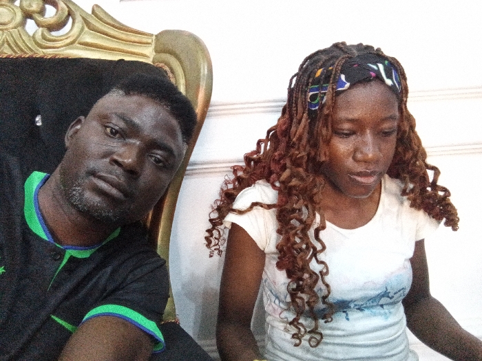 The image displays two individuals seated within an interior room. On the left, an adult male of dark complexion, with short dark hair and light facial stubble, looks directly at the camera. He wears a black short-sleeved polo shirt with green and blue trim on the collar and sleeves, and is seated in an ornate, gold-colored high-backed chair. To his right, a young adult female of dark complexion, with long brown braided and curly hair styled with a multicolored headband, looks downwards and away from the camera. She is dressed in a white short-sleeved t-shirt featuring a faint blue graphic design on the front. The background consists of a plain, light-colored wall. The specific location within the city of Unknown, Unknown is an undeterminable indoor setting, likely a residence or common room, lacking exterior identifiers.