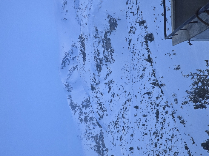 The image presents a snow-covered mountain landscape under a clear blue sky, indicative of winter conditions in the vicinity of Panichishte, Bulgaria. The central and upper portions of the frame are dominated by rugged mountain peaks and slopes entirely blanketed in snow, with visible rocky outcrops protruding through the white covering. Scattered coniferous trees are visible across the lower and mid-slopes. In the lower right foreground, a gray concrete ledge or balcony edge is present, featuring a dark metal railing along its perimeter. A metallic faucet is attached to the vertical side of this concrete structure, and a dark, coiled object, possibly a hose or cable, rests on the ledge. No individuals, animals, or active subjects are depicted within the scene.