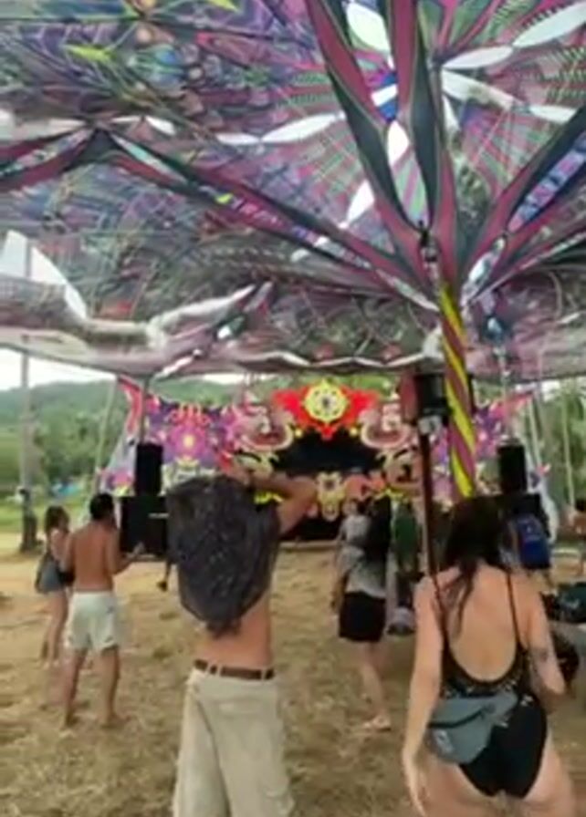 dance party, in what appears to be a rural or semi-rural area, on a patch of dry grassland. Attendees, mostly young adults, are dancing to music coming from a stage area. Many are shirtless, in shorts, or in swimsuits. A large, decorative shade structure, featuring psychedelic patterns and geometric shapes, covers the immediate area. Trees and vegetation can be seen in the background, as well as some parked vehicles. The sky is overcast.