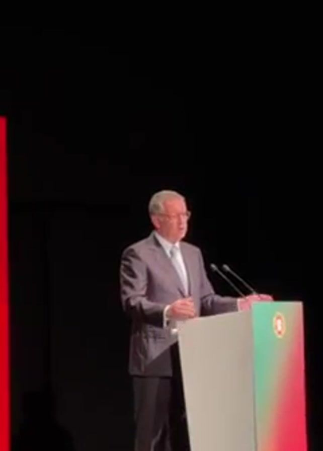 A man in a dark suit with a blue tie stands behind a podium on a stage giving a speech. The podium has a design featuring the colors of the Portuguese flag. The background is black, with a red structure visible to the left of the podium. Two microphones are on the podium. The man gestures with his hands as he speaks. A partial view of an audience is visible in the bottom right corner.