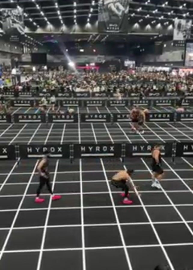 fitness competition called HYROX, taking place in a large indoor arena filled with a crowd of spectators