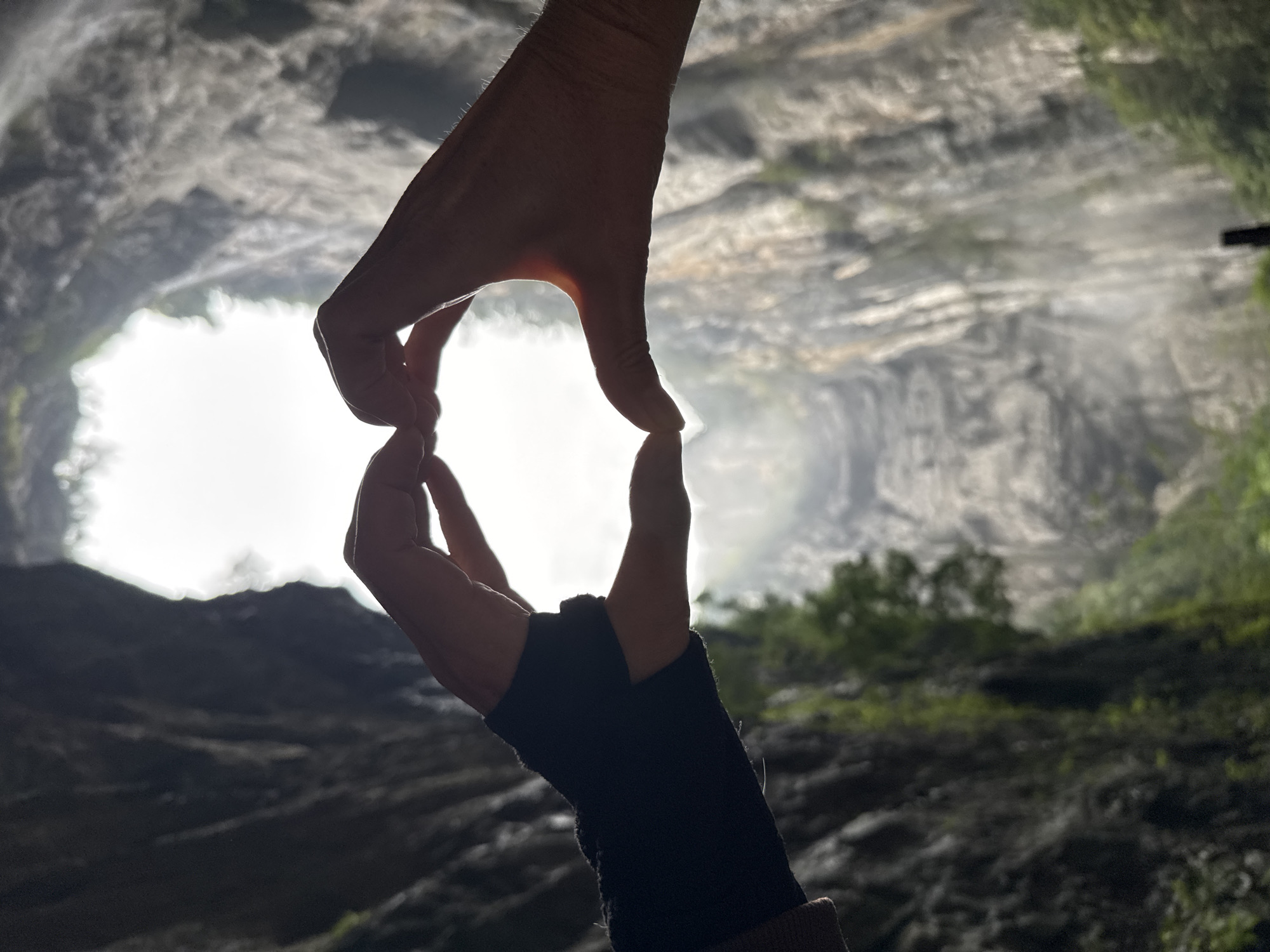 two hands framing a view of the Three Natural Bridges in Wulong District, China