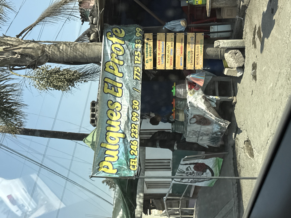 A roadside stand identified as "Pulques El Profe" offers a variety of food and drinks