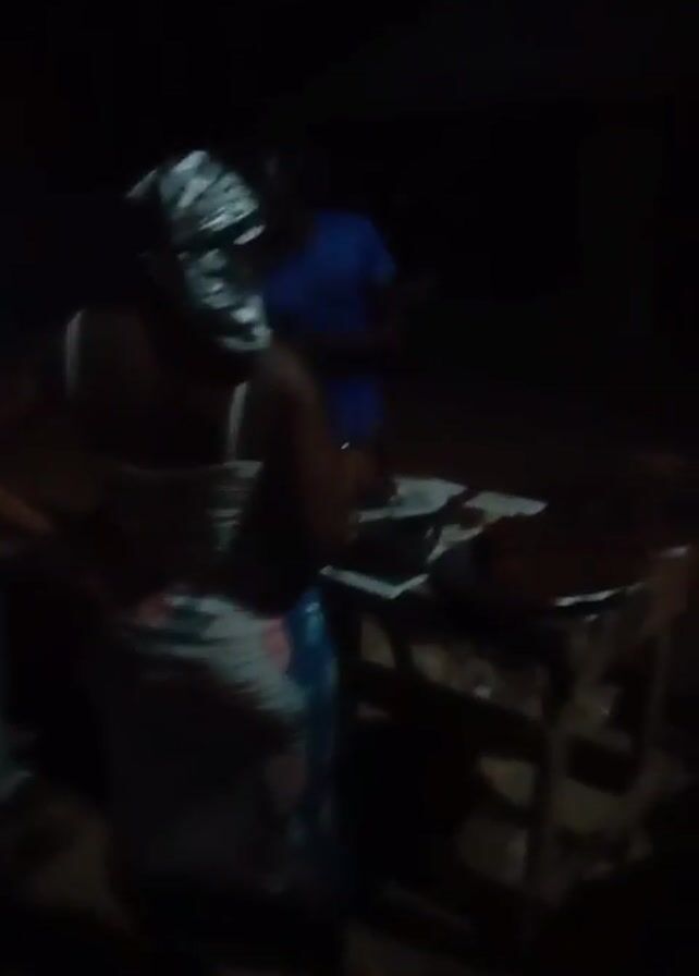 nighttime scene with a group of people gathered around a table. It is dark and the video is somewhat blurry. A woman wearing a white dress with floral patterns and a head covering stands with her back to the camera. Another person is visible in a blue shirt standing behind the table. The table holds plates and what appears to be food, possibly fried plantains. The background is dark and indistinct, making it difficult to discern details about the environment.