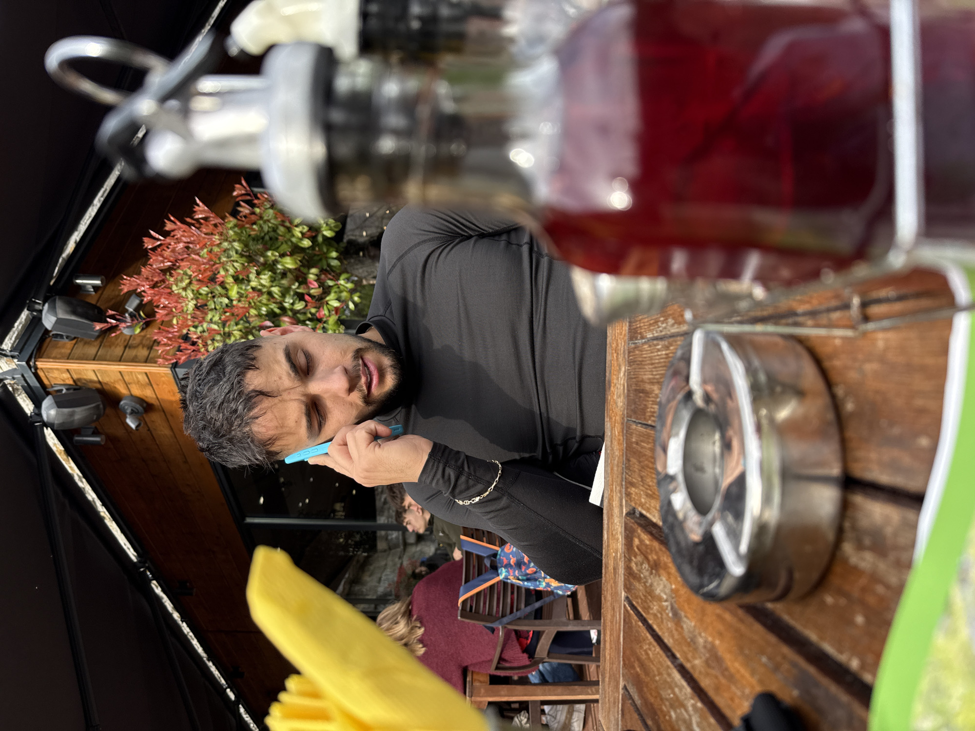 man sitting at a wooden table in what appears to be an outdoor seating area. He is holding a blue object, potentially a lighter or electronic cigarette, near his mouth and appears to be talking on the phone. He is wearing a black long-sleeved shirt and a gold bracelet. Other people are seated in the background. A glass bottle filled with a red liquid sits on the table along with a metal ashtray. A yellow object partially obscures the foreground. The surrounding environment includes greenery and an awning, suggesting an outdoor cafe or restaurant setting. The image is rotated slightly, potentially taken from a tilted angle. There is nothing in the image to suggest that the location is Milanovo, Bulgaria.