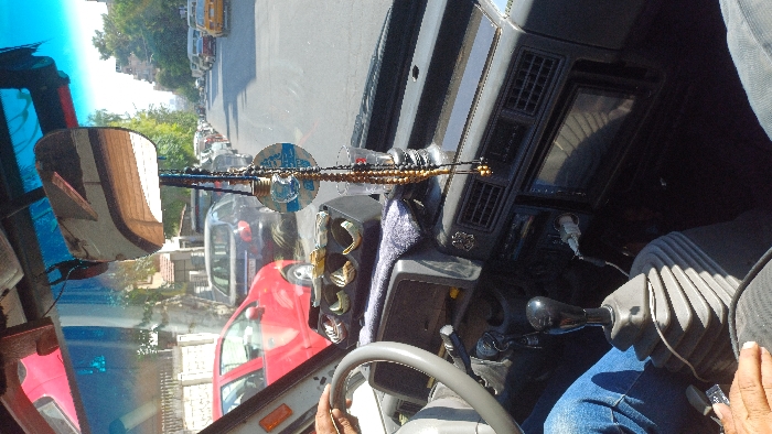 The image provides a forensic view from the interior of a vehicle, looking out onto a street in Babella, Syria. **Vehicle Interior:** The foreground is dominated by the vehicle's dashboard and controls. The driver's right hand, wearing a ring on the pinky finger, is visible gripping a grey steering wheel. Below, the driver wears blue jeans. A black manual transmission gear shift lever with a grey ribbed boot is situated between the driver and passenger sides, with a white cable extending from its base. The dashboard is partially covered by a crumpled blue cloth. On the dashboard, a black organizer with four compartments holds various paper currencies. A black multi-media unit with a dark screen is integrated into the center console. Air vents are visible on the dashboard. A string of brown and black prayer beads, accompanied by a circular blue and white charm/air freshener, hangs from the central rear-view mirror. A small, clear glass or cup is positioned on the dashboard beneath these hanging items. The windshield's upper section features a blue tint or film. **Exterior Scene:** The view through the windshield reveals a paved street with multiple lanes, indicating an urban setting. Traffic appears to be either stationary or moving slowly. Directly ahead and slightly to the left, a red compact hatchback is visible. Behind it, a dark-colored sedan follows. Further down the road, a line of parked or queued vehicles is present on both sides, including various sedans and a distinct yellow taxi on the right. Multi-story buildings with trees and green foliage line both sides of the street under a clear, bright blue sky, suggesting daylight conditions.